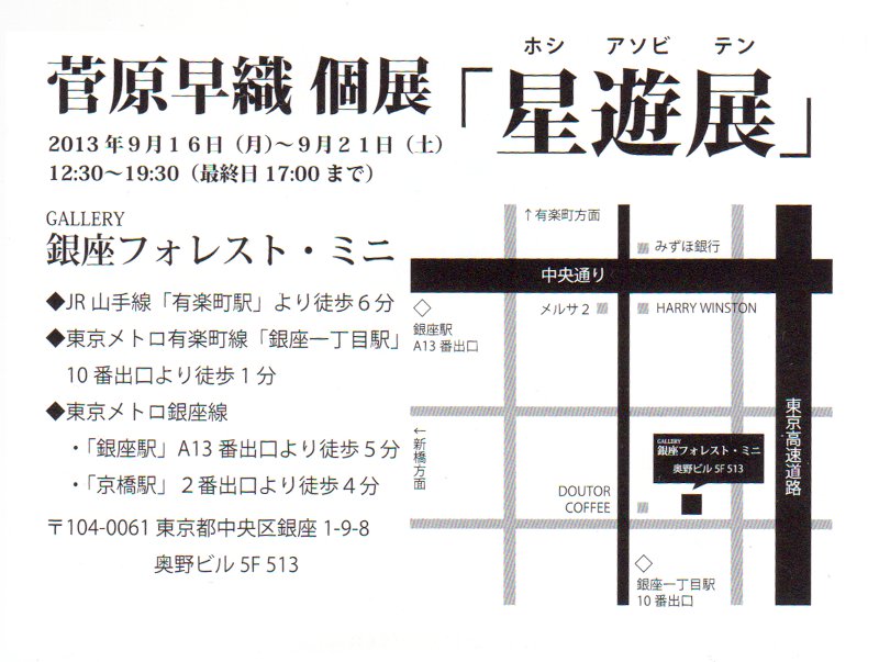 2013/09/05 Category : 日記 菅原早織さん個展「星遊展」 私の切り絵友達の菅原早織さんから初めての個展の案内状が届きました! なんと、銀座で個展を開催されるとのことです。 クリックで拡大します 菅原早織個展「星遊展(ほしあそびてん)」 GALLERY銀座フォレスト・ミニ 2013年9月16日(月)~9月21日(土) 12:30~19:30(最終日17:00まで) 最寄駅:有楽町駅・銀座一丁目駅・銀座駅・京橋駅 私も今手掛けていることがひと段落したら久しぶりに展示などしてみたいなあ~と思わされる最近です。