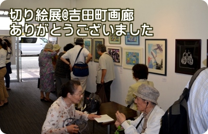 2013/07/18 Category : 日記 切り絵展@吉田町画廊ありがとうございました 2013年7月1日~7月7日まで横浜・吉田町画廊にて開催されておりました切り絵展@吉田町画廊も無事に終了致しました。 お越しいただいた方々、ありがとうございました。 私は会期中に行くことはできませんでしたが、画廊の方より開催中の様子の写真をいただきました。 想像以上にたくさんの方にご覧になっていただけたようです。 切り絵の展示というもの自体があまり数の多くないもののようなので、特に多くの方に楽しんでいただけたようです。 白と黒、カラーでもその着色の方法、紙の材質。 それだけでも全く印象の違う作品になります。 やはり切り絵というジャンルは、皆様とても、思いもよらないアイデアと技法でいらっしゃいました。 私も多くの刺激を受ける展示となりました。これからも精進致します。