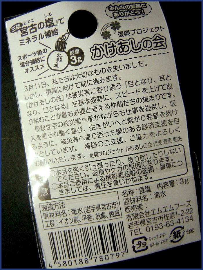 2013/08/15 Category : 日記 チャリティ企画の支援の輪 先日、東日本大震災チャリティ展示でお世話になったギャラリートモズ様から、こんな素敵なストラップが送られてきました! 岩手の「宮古の塩ストラップ」です。 直接支援品として購入され、チャリティに参加した人に送られているそうです。 先日のチャリティ企画では仙台市若林区児童館へ絵本を16冊贈ることもできたそうです。 ストラップの中には本物の塩が詰まっていて、最近の酷暑の中の熱中症対策にも重宝しそうです。 (クリックで拡大します) こちらがパッケージ裏面です。 いろいろ考えさせられる言葉が書いてあります。 支援の輪を作ってくださっている皆様、ギャラリートモズ様にも感謝するばかりです。 いつでも取り出せるように、早速携帯電話に着けました。