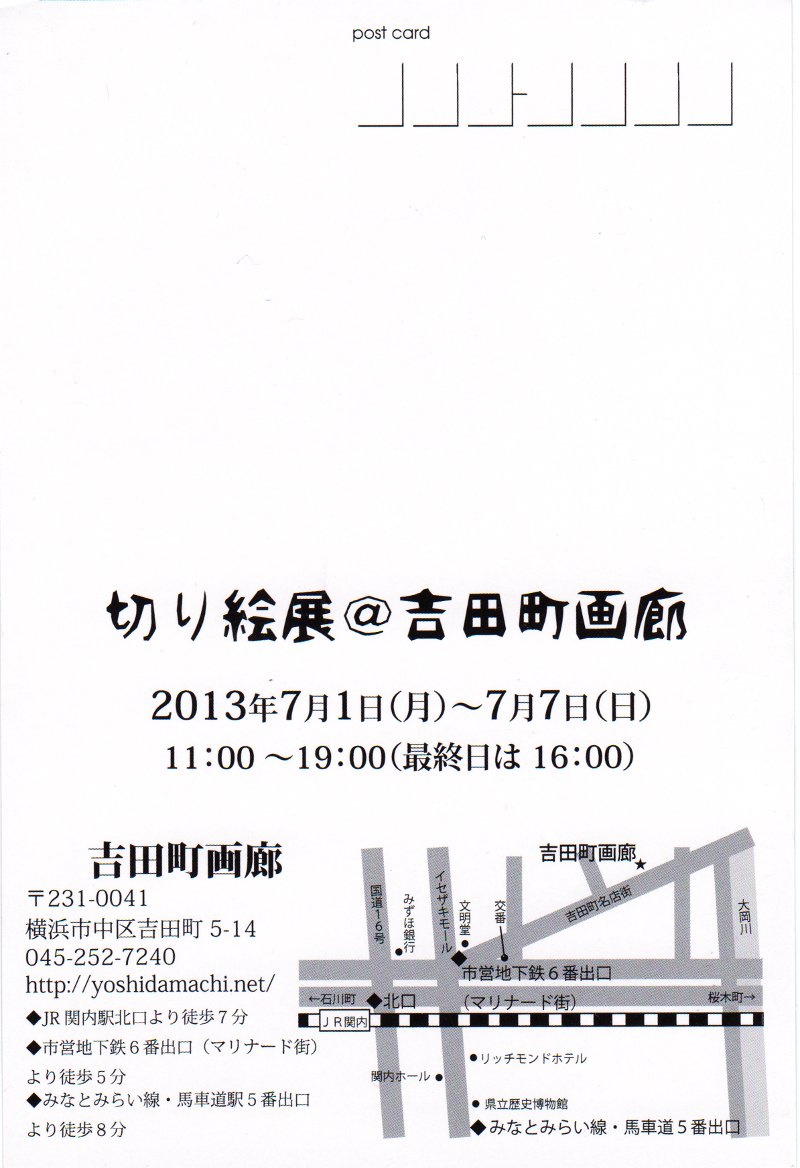 2013/06/28 Category : 展示・イベント情報 7月の展示のご案内 今回は展示のご案内です。 7月は横浜と東京・八重洲にて切り絵の展示をさせていただきます。 まずは、七月第一週に開催されます、横浜・吉田町での展示のご案内です。 切り絵展@吉田町画廊 2013年7月1日~7月7日 横浜・吉田町画廊 いつもお世話になっております、吉田町画廊様の初の切り絵の展示に参加させていただきます。 今回は全て切り絵の展示ですので、切り絵にご興味のあられる方にとてもお楽しみいただけると思います。 こういった合同展はどんな作品が集まるのか予想もつかないので楽しみですが、会期中私はフランスに行ってしまっているので見ることはできないと思います・・・。 是非、私の代わりにご覧になってください。 こちらの切り絵展@吉田町画廊には、以前Ber 黒い月に展示させていただいておりました「黒い月の薔薇」と、小さい作品を展示させていただく予定です。 クリックで拡大致します 次は、東京八重洲にございますウインドウギャラリー「ダイヤ」での展示のご案内です。 Tomo'sの輪展 その1 2013年7月1日~7月28日 東京駅ダイヤ八重洲口ビル地下一階 ウィンドウギャラリー「ダイヤ」 以前、震災チャリティー展でお世話になったギャラリートモズ様のご縁で参加させていただくことになりました。 ギャラリートモズのオーナーと仲間たち、といったような表現方法のバラエティに富んだ展示になるようです。 こちらの展示は、「輪展」展示自体は1日から開催されますが、私の作品出展は私がフランスから帰国してからの展示になりますので、7月中旬からの展示になります。申し訳ございません! こちらの「輪展」には、上記切り絵展@吉田町画廊で展示する「黒い月の薔薇」の他に、スペースがありそうでしたら、他の小さい切り絵作品も展示する予定です。 クリックで拡大致します クリックで拡大致します 7月の国内は上記二つの開催です。 お近くにお立ち寄りの際は是非ご覧になっていただければ幸いです!